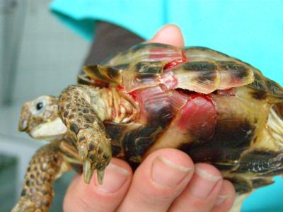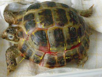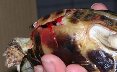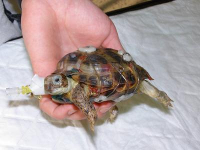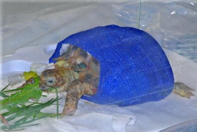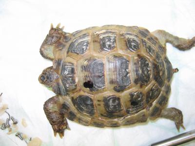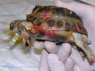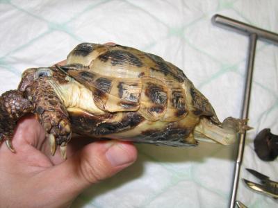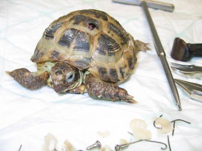 Vše proběhlo hladce - šrouby i epoxid se podařilo odstranit bez poranění krunýře. Ještě se ranky po šroubech ošetřily roztokem Novikov a celý krunýř se pro jistotu na 2 měsíce stáhnul obinadlem.